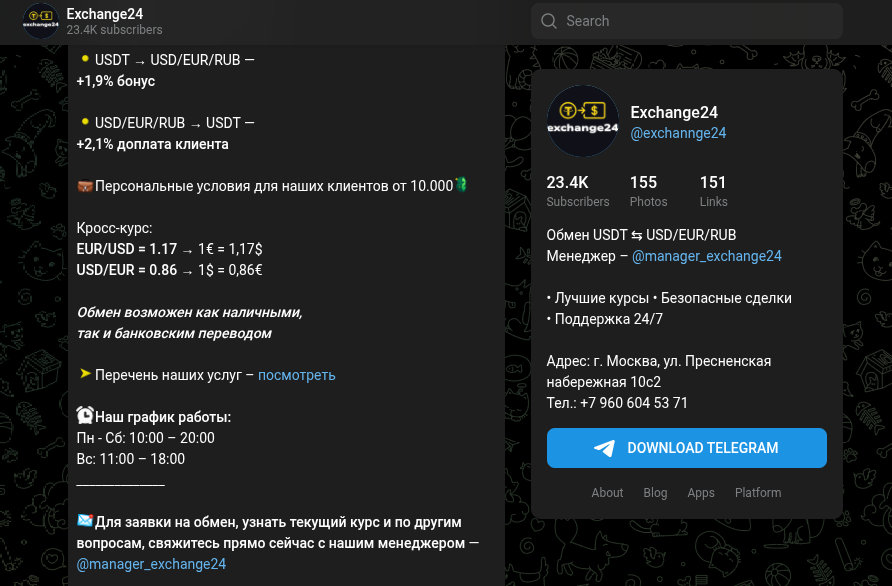 Легенда у проекта Exchannge24 довольно стандартная – быстрый и безопасный обмен USDT, USD, EUR и RUB с «лучшими курсами». В описании канала даже указан физический адрес в Москве (Пресненская набережная 10с2) – явная попытка войти в доверие и выглядеть солидней. Однако нет никаких реальных подтверждений, что там действительно находится офис конторы. По указанному адресу расположен обычный бизнес-центр, где о таком обменнике никто и не слышал.