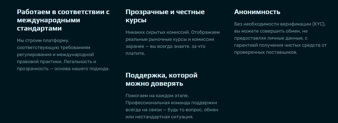 - Нет прозрачности. Обменник скрывает юридическую информацию — нет данных о регистрации, лицензиях или владельцах. Это серьезный риск для пользователей.