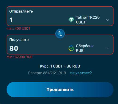 Также стоит обратить внимание на минимальные суммы для обмена — от 400 USDT или 32 000 RUB. Минимальный обмен не позволяет протестировать сервис. Для новых клиентов это неоправданный риск — лучше выбрать обменник с меньшим порогом входа.