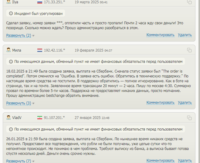 Зато жалобы выглядят куда более убедительно. Пользователи регулярно сталкиваются с проблемами при работе с Exch-em.com. Вместо заявленных 20-30 минут выплаты задерживаются на несколько часов. Операции внезапно прерываются с ошибкой без объяснений. Поддержка не отвечает. Для финансового сервиса — недопустимо.