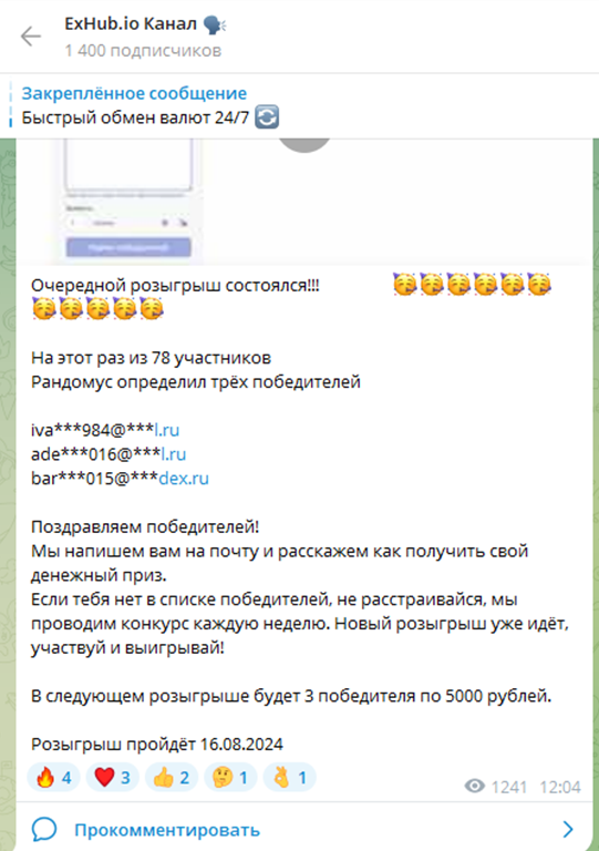 Также у обменника Exhub io допустим обмен через отдельного чат-бота в телеграмм. Функционал его ничем не уступает полноценному сайту.А на основном канале в тг, можно ознакомиться с новостями торговой платформы ExHub и даже поучаствовать в розыгрыше токенов. Раздачи регулярно устраивают в чате ExHubRuChannel разработчики. Админом сообщества является некто под ником Exhub4842, в данный аккаунт можно также написать при возникновении сложностей с использованием сервиса.