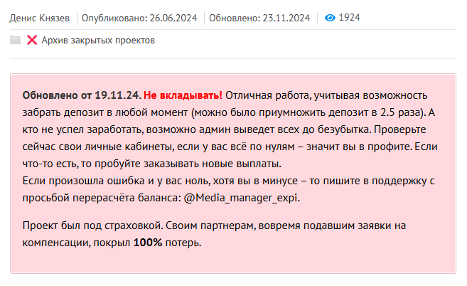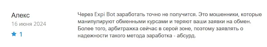 Но разработчики не могли повлиять на независимые площадки, где можно было делиться реальными впечатлениями о Expibot. И в тех комментах раскрывалась суть проекта — нет документов (значит работают нелегально), нет данных о создателях обменника, курсы подделываются, разводят на деньги и т.д.