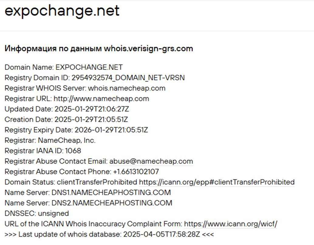 К тому же в футере сайта Expochange net есть информация о сроке существования с 2025 года. Но это неправда, так как домен был запущен в январе 2025 года.