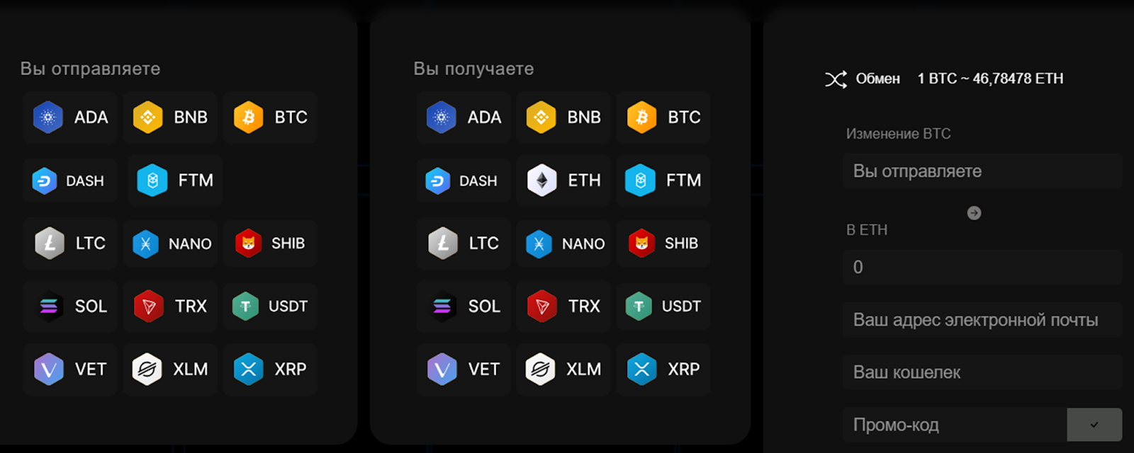 Заявлено, что пользователь может обменять любую из монет, представленных на криптобирже Binance. При этом гарантирован более выгодный курс. Но, что самое интересное, в перечне доступных монет в разы меньше токенов и реальных направлений в разы меньше обещанных. На фиат обмена нет, как и покупки крипты с карты тоже не предусмотрено. Размеры комиссий не уточняются, вероятнее всего, сбор заложен в курс.