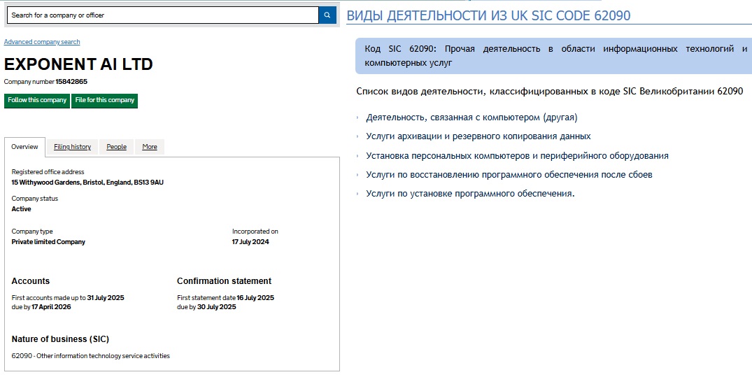 Со слов основателей, компания EXPONENT AI LTD работает с 2022 года, она зарегистрирована в Великобритании №15842865, офис находится в Бристоле, по адресу 15 Withywood Gardens. Проверка показала, что фирма действительно существует, она зарегистрирована в мае 2024 года, основное направление деятельности — обслуживание ПК и периферийных устройств. Никакого отношения к инвестиционной платформе она не имеет.