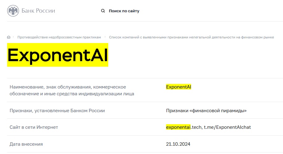 Поскольку минимальный инвестиционный цикл закончился всего несколько дней назад, а для обработки заявки на вывод предусмотрено три дня, то отзывы об Exponentai x пока не появились. Но, судя по описанию условий и акценту на привлечении новых инвесторов, мы имеем дело с обычной финансовой пирамидой. Это подтверждается и выводами ЦБ РФ, который внес компанию в свои черные списки.