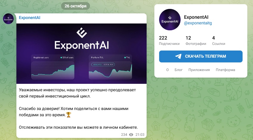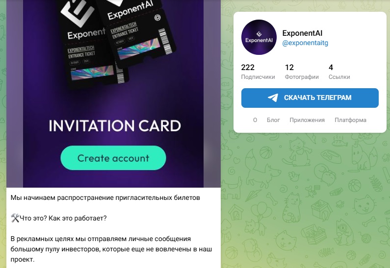- Телеграм @exponentaitg создан 8 сентября, первые публикации появились 14.09, подписано 222 человек, размещено 13 постов. Реакции и комментарии закрыты, разработчики не заинтересованы в фидбеке.