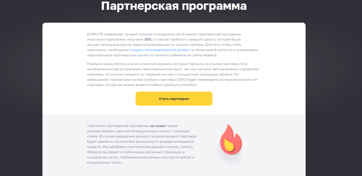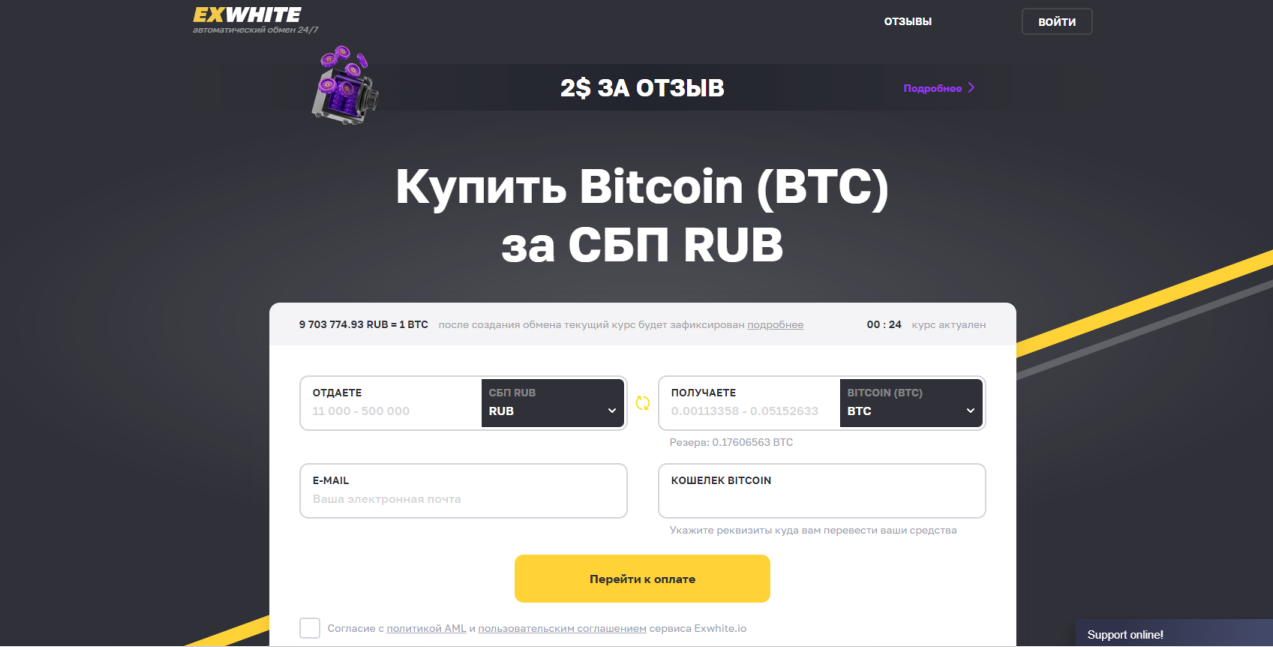 На веб-ресурсе сервиса указано, что обменник работает круглосуточно, а все транзакции происходят мгновенно. Партнерами проекта выступают: Bits Media, BestChange, Glazok и прочие компании. Связаться с саппортом можно с помощью электронной почты mail exwhite io.