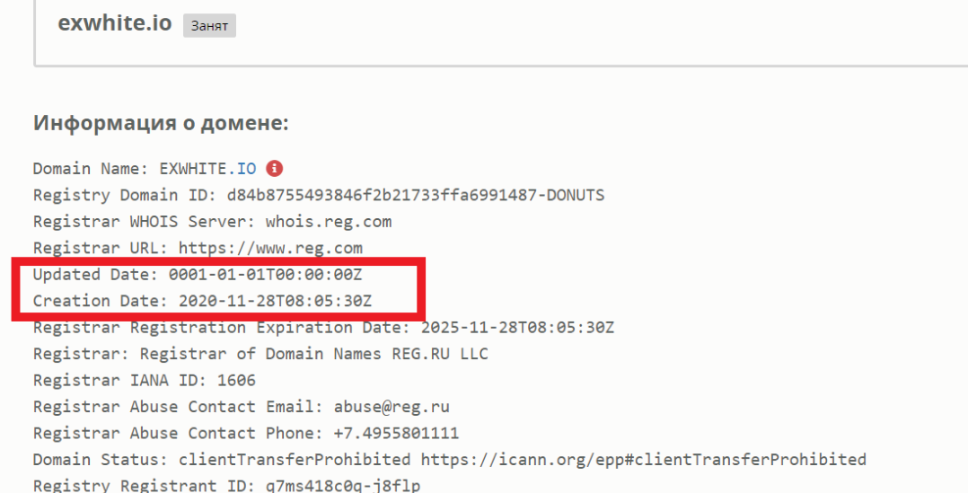 На веб-ресурсе обозначено, что Ex White io является безопасным и отказоустойчивым сервисом по обмену криптовалют. Информация о разработчиках, как и дорожная карта проекта, отсутствует. Мы проверили домен площадки, и он был создан в 2020 году.