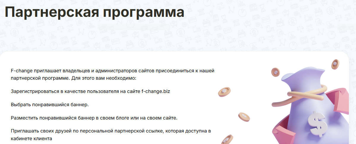 F Change активно продвигает партнерскую программу как инструмент привлечения пользователей. Вознаграждение партнера зависит от суммарного оборота личных и привлеченных операций. Оно может достигать 50% от прибыли сервиса на максимальном уровне.