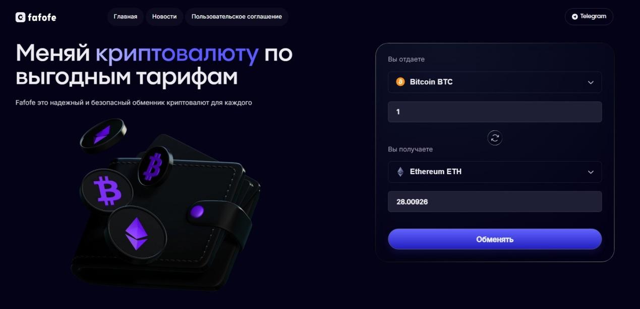 Fafofe – обменник криптовалют. Предлагает быстрый и выгодный обмен. Обещает безопасность транзакций. Стоит ли пользоваться им, расскажем в нашем обзоре.