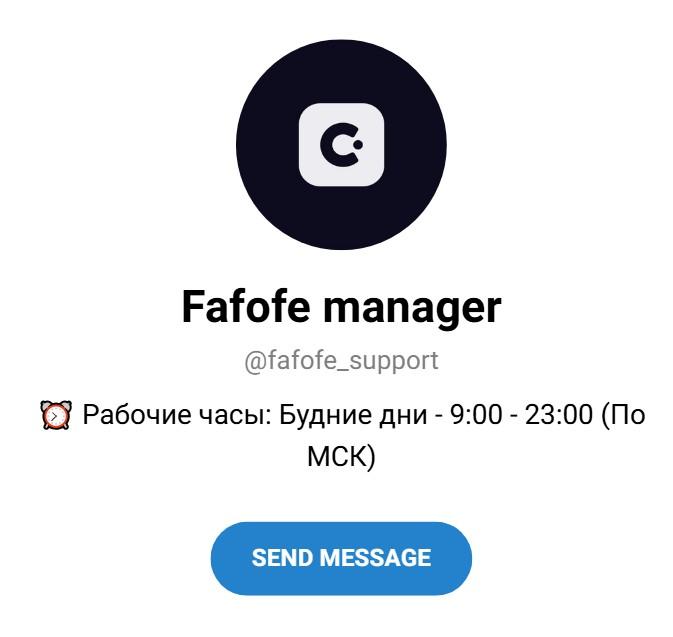 Для связи со службой поддержки клиентов указан только аккаунт в Телеграме – Fafofe Manager (fafofe support). Других контактов нет. Это характерно для мошенников. Официальные каналы в соцсетях и мессенджерах у проекта отсутствуют, что тоже странно.