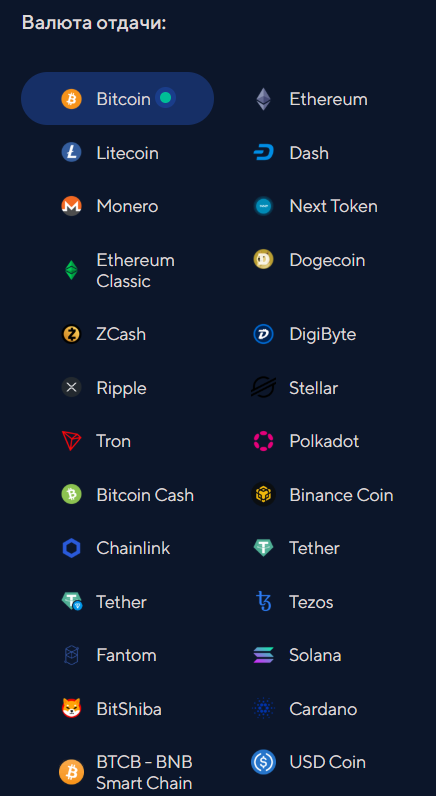 Выводить рубли или доллары, которые клиент получает после обмена, можно на Visa или карты банков Сбер, Альфа и Тинькофф. Есть ли возможность обмена на другие фиатные валюты кроме долларов и рублей не сообщается.