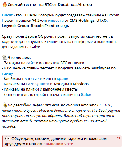 Следующий материал касается предстоящего тестнета от Ducat. Здесь мы также видим подробную схему действий: зайти на сайт, подсоединить кошелек и подключиться к нужной сети. Большое количество подробностей — несомненный плюс для тех, кто готов участвовать в мероприятии, но не имеет достаточного опыта в децентрализованных финансах.