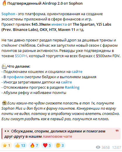В основном все посты этого ресурса посвящены предстоящим раздачам DeFi-монет, которые можно получить за выполнение конкретных действий. Например, автор канала анонсирует airdrop от Sophon. Он подробно описывает, что надо сделать для участия: подключить кошелек, выполнить задания и так далее. Это ценная информация, если подписчик хочет получить себе конкретный актив и заработать на нем в будущем.