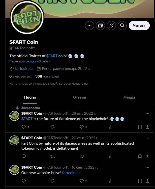 У FartCoinCrypto есть твиттер-аккаунт, просмотр которого уже полностью отбивает желание всерьез рассматривать актив. В данном профиле всего около 370 читателей, публикаций почти нет, да и последние из них сделаны в 2022-м году. Сейчас уже в принципе непонятно, функционирует ли монета или нет. Здесь же есть ссылка на официальный сайт, но он, как можно понять, тоже неактивен.