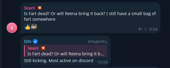 Однако владелец группы все еще активен в Telegram, более того, судя по описанию, сейчас он занимается другим проектом. Данное название следует запомнить, т.к. учитывая судьбу FARTcoinpfft, то же самое может произойти и здесь.