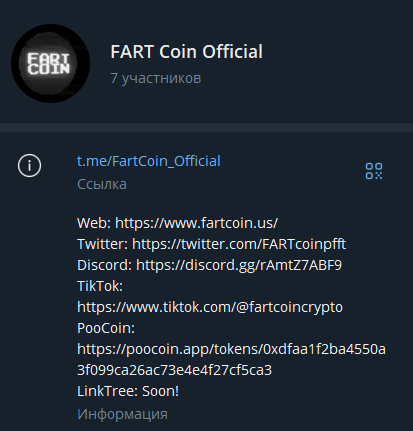 В Telegram полноценного сообщества у монеты ФартКоин нет, но есть чат, где всего 7 участников – а это уже характеризует актив как абсолютно бесперспективный. Здесь тоже есть ссылка на все соцсети и другие площадки с информацией о коине, но ничего из этого не работает.