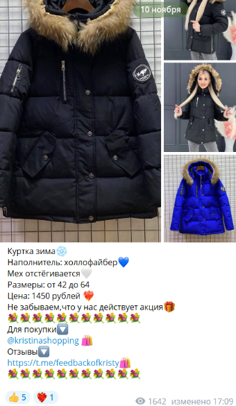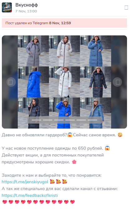 Магазин в Телеграмм Fashion shop (Женский уголок) изначально не выглядел надежным для совершения покупок. Пользователей пытались привлечь очень низкими ценами на текстиль и одежду, но, по всей видимости, обманывали на полной предоплате. Среди ключевых аспектов были выделены: