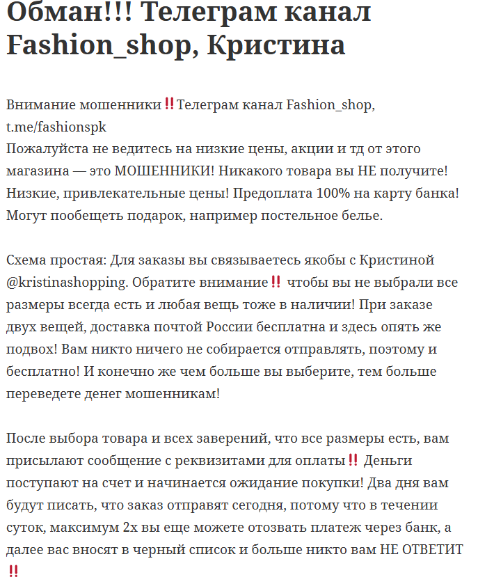 Fashion shop – Телеграм-магазин, на котором пользователям предлагалась женская одежда и постельное белье по ценам значительно ниже рыночных. Продавцом выступала некая Кристина. Несмотря на активную рекламу проекта в социальных сетях и интересные предложения, магазин собрал массу негативных отзывов. Узнаем, с чем это связано.