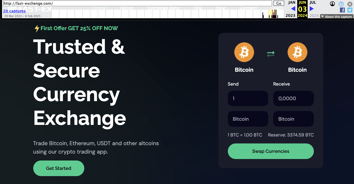 В сервисе WayBackMachine есть 20 снимков сайта fast exchenge com. На всех из них корректно отображается ресурс обменника.