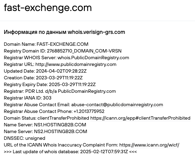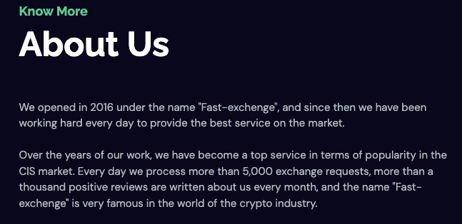 На странице About Us заявлено, что платформа была открыта в 2016-м году. Чтобы в этом убедиться, мы запросили данные доменного имени fast exchenge com из сервиса Whois.