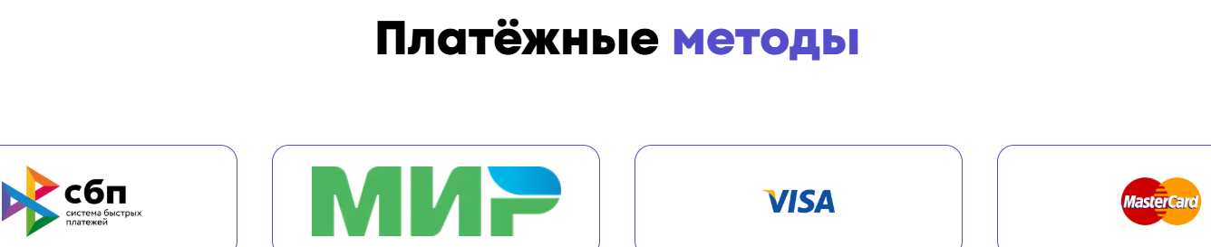 Доступны платежные системы Visa, MasterCard, Мир, а также Сбер, Т-Банк, Альфа, ВТБ и Райффайзен. Есть переводы через СБП.
