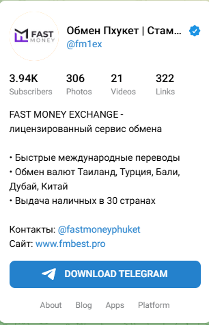 Обменник Fast Money отмечает, что у него есть синяя галочка Telegram — признак проверенной компании. Действительно, она имеется у канала Fm1ex, это очень хороший признак.Поддержка — через бота в телеграме, где можно сразу подать заявку на обмен и узнать курс. Также есть Whatsapp, телефон и наземный офис: вариантов достаточно много, это удобно.
