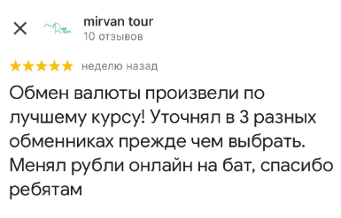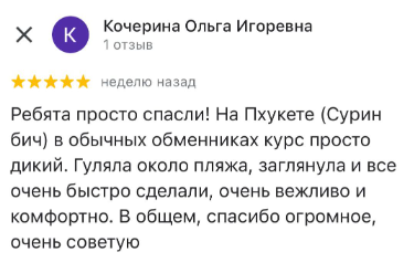 Другой пользователь рассказывает, что в других точках просто дикий курс, в то время как в «Фаст Мани» ему продали баты по нормальной цене, быстро и комфортно.