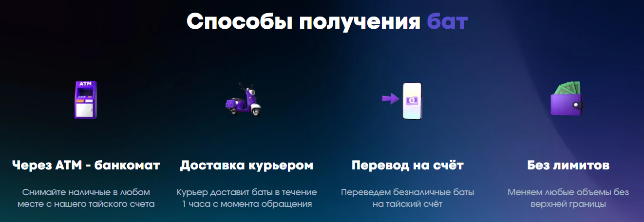 Способы получения бат — банкоматы Fast Money Exchange на Пхукете, курьерская доставка или перевод на номер счета. Лимитов для операций нет.