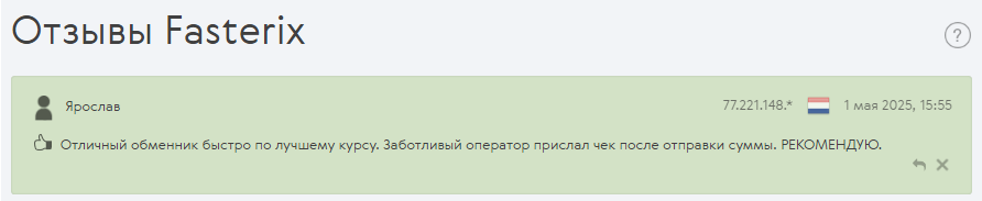 Изучим отзывы о Fasterix, оставленные пользователями на крупных мониторинговых площадках. Клиент по имени Ярослав похвалил работу крипто обменника и рекомендовал его другим читателям.
