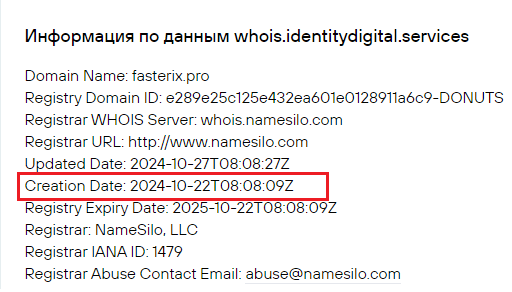 Проверка WHOIS домена fasterix pro показала, что сайт был создан в октябре 2024 года. Небольшой возраст площадки вызывает подозрения.