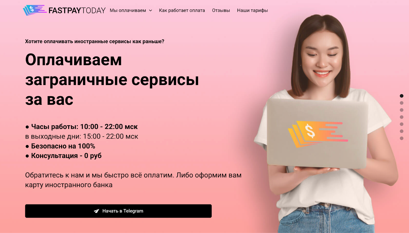 Fast Pay Today позиционируется как посредник между клиентом и иностранными сервисами. Проект обещает оплату подписок, маркетплейсов, авиабилетов, бронирований и цифровых сервисов. В промо материалах встречается формулировка про FastPay Today оплачиваем зарубежные сервисы за вас, что отражает основную модель работы. Пользователь переводит средства в рублях, после чего команда проводит оплату через свои инструменты.