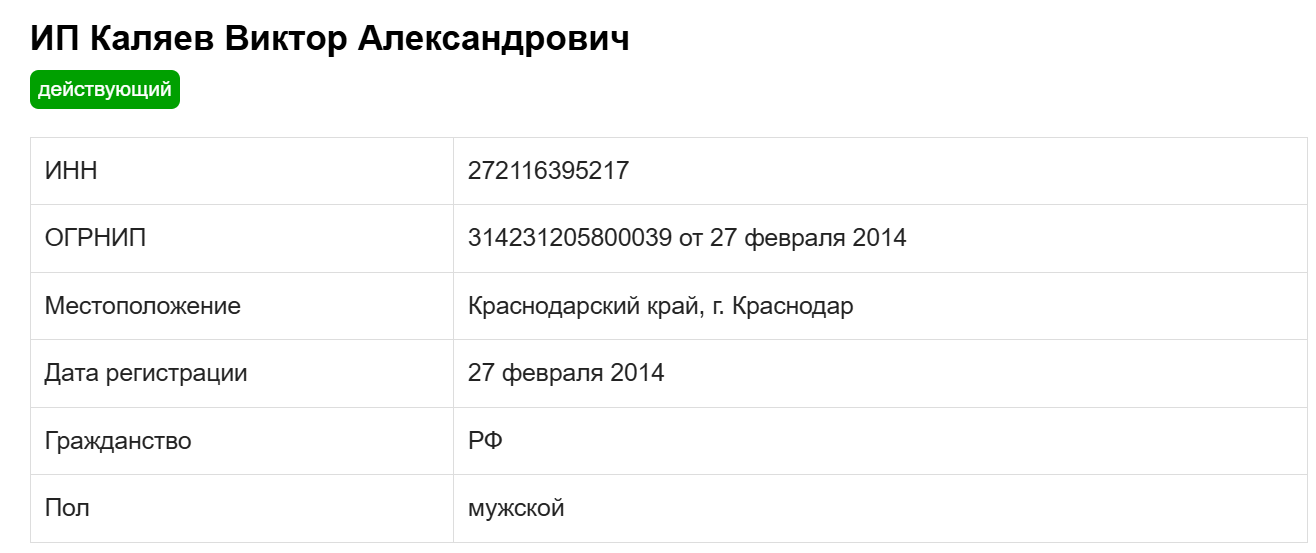 В футере сказано, что основателем платформы является ИП Каляев Виктор Александрович. Он зарегистрирован по адресу Краснодар, ул. Сормовская, дом 218, кв. 22. В качестве основного направления деятельности заявлено создание компьютерного ПО. Более подробные сведения отсутствуют.