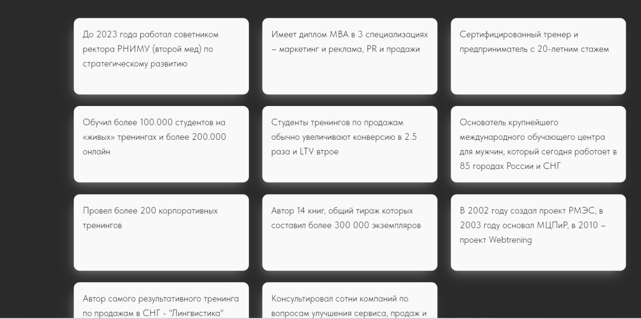 Предприниматель является автором тренинга “Лингвистика”, который был наиболее продаваемым в СНГ. Помимо этого, провел консультации для 100+ компаний. Сотрудничал с: Северсталь, МДМ Банк, Аэрофлот и прочими. Как указано, Филипп имеет сертификат для работы. На веб-ресурсах он действительно размещает сканы документов.