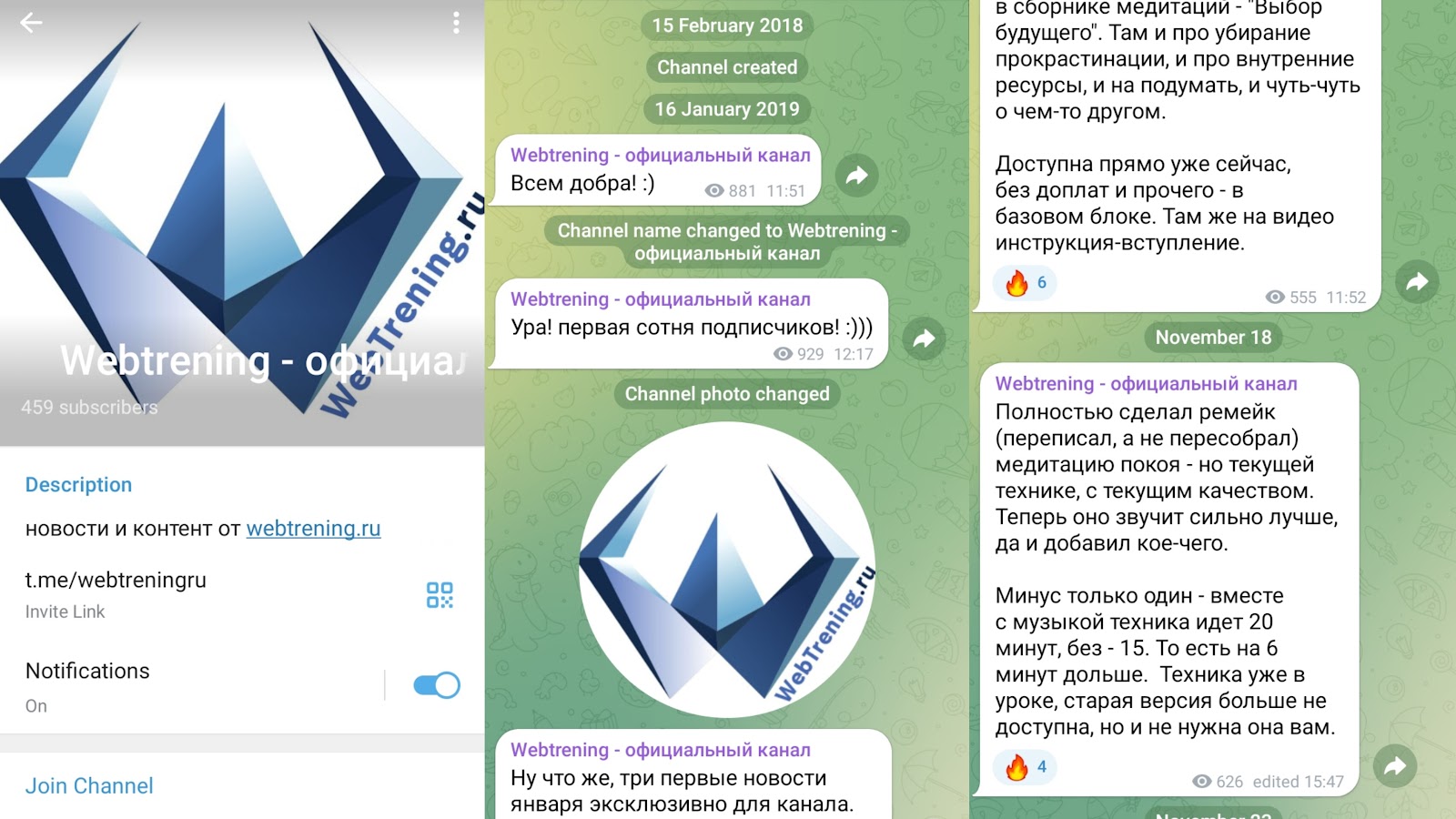 Телеграмм канал Webtreningru (Webtrening Официальный Канал) основан в 2018 году. Здесь 400+ подписчиков.
