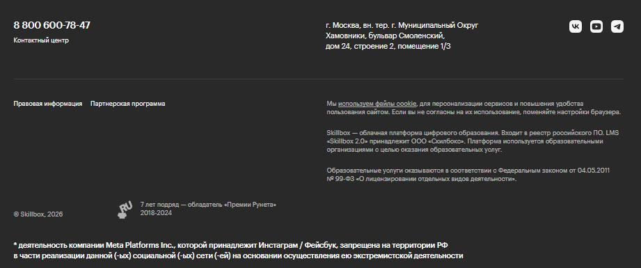 Контактные данные Skillbox включают основной телефон контактного центра 88006007847. Он является бесплатным для звонков из России и предназначен для консультаций по вопросам покупки курсов, оплаты и содержания программ. Дополнительно имеются телефоны для регионов.