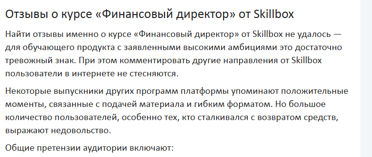 Отзывов о курсе «Финансовый директор: правая рука собственника» от Skillbox крайне мало. Пользователи на форумах отмечают высокую цену и сомневаются в реалистичности обещаний быстрого перехода на позицию CFO. Но историй прохождения этого курса с критикой не обнаружено.