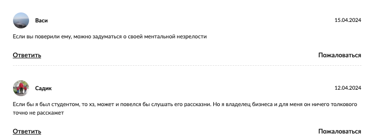 - в отзывах на тематических сайтах пользователи выражают свое скептическое отношение к Алексею.