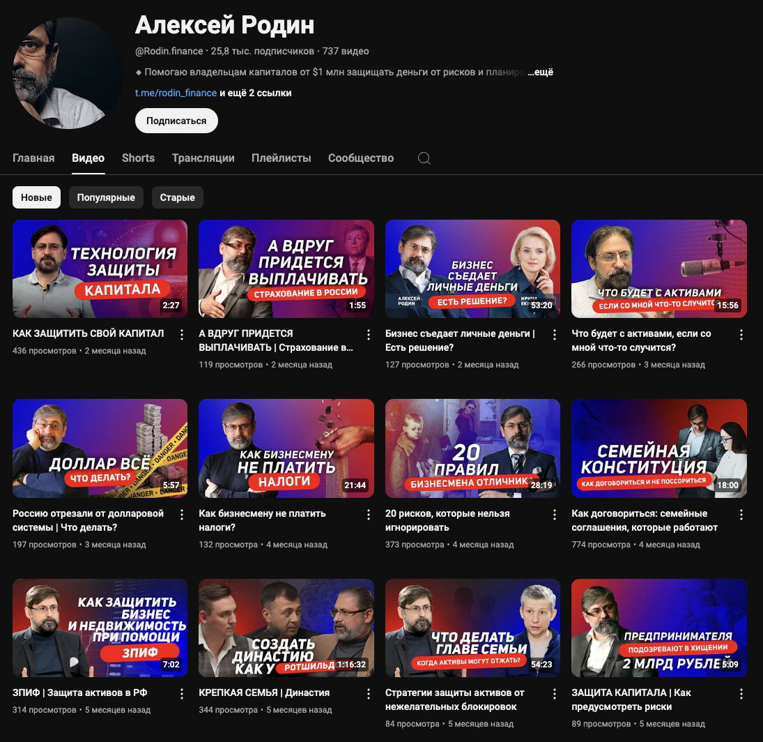 Также у Алексея Родина есть и канал на Ютуб – Rodin Finance. На него подписано почти 26 тысяч пользователей. Однако это не сильно спасает положение. Среднее количество просмотров видео на канале – всего 200-300 раз. И это выглядит довольно странно.