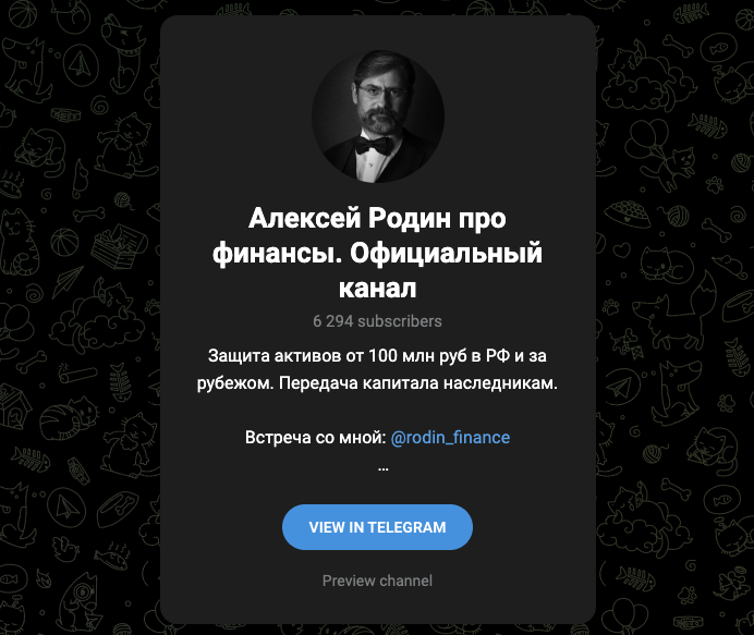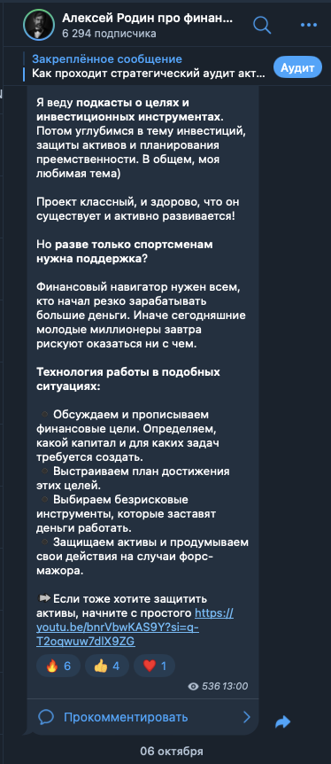 На телеграмм-канал «Алексей Родин Про Финансы Официальный Канал» rodinfinance, на 9 октября 2024-го года, подписано около 6,3 тысяч пользователей. Однако далеко не вся сформированная аудитория продолжает интересоваться контентом от данного инвестора.