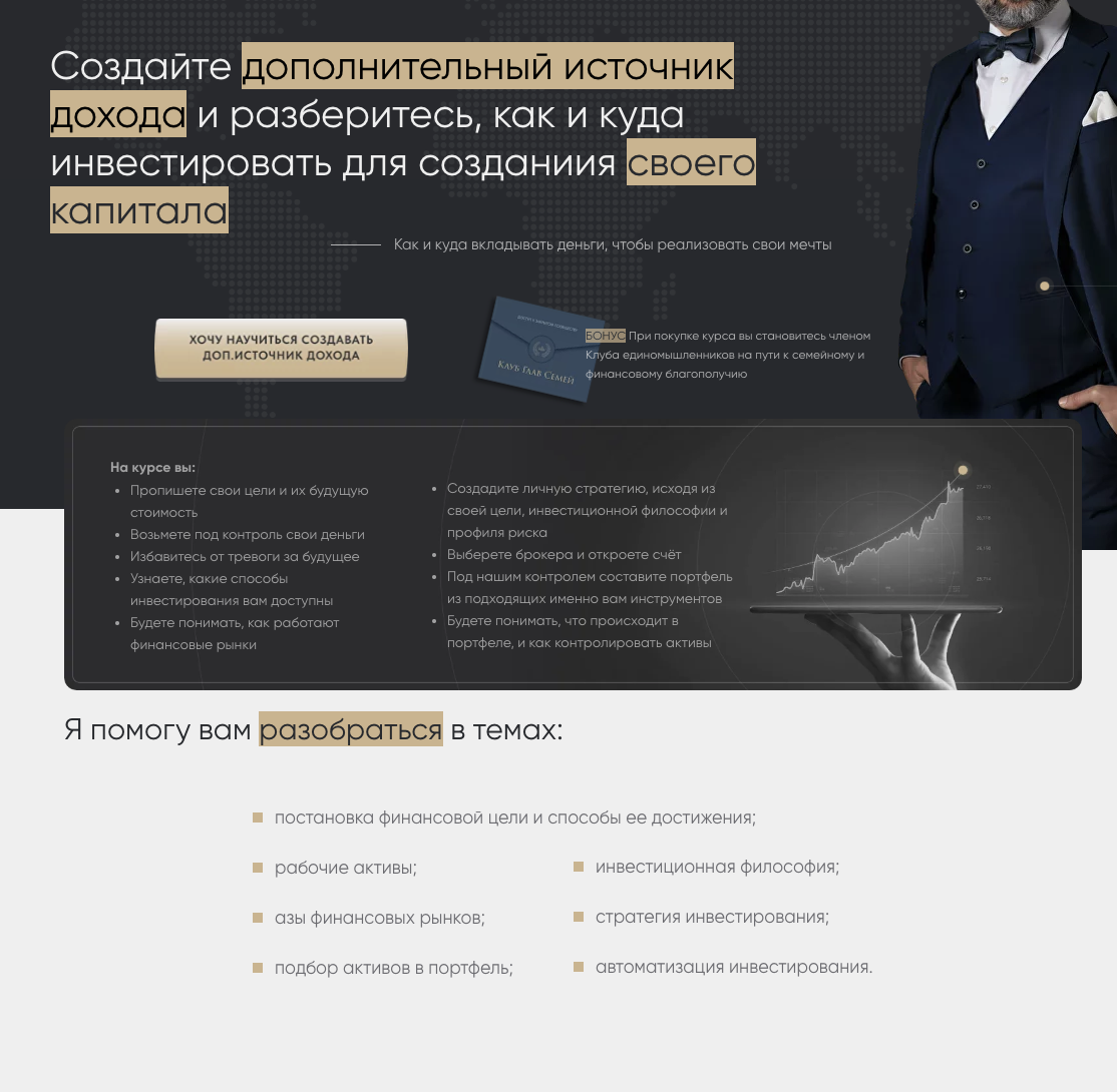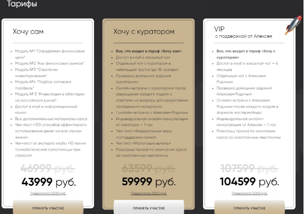 Полноценное обучение, в свою очередь, предоставляется в соответствии с одним из тарифов. Самый дешевый из них стоит 44 тысячи рублей. Он предполагает самостоятельное обучение. Если требуется куратор, то за него потребуется дополнительно заплатить 15 тысяч. Поддержка от самого Алексея стоит, в свою очередь, значительно дороже. Такой курс обходится в 105 тысяч рублей.