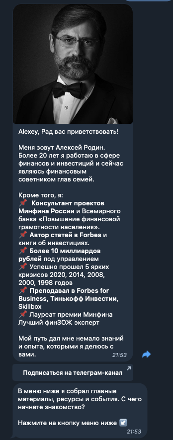 Чтобы стимулировать потенциальных клиентов становиться реальными, в телеграмм предусмотрен специальный бот – rodin invest bot. Через него предоставляет базовая информация об инвестировании.