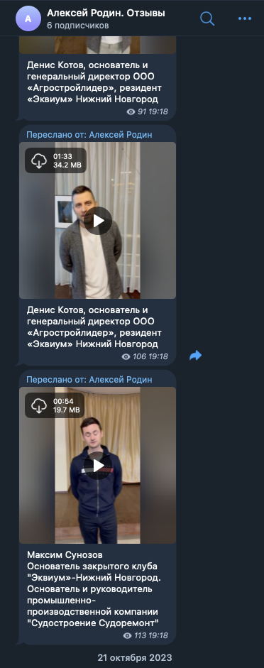 Отзывы о «Финансовом советнике Алексее Родине» представлены на отдельном телеграмм-канале этого специалиста – Rodin Otzyv. На нем размещены ревью в формате видео.
