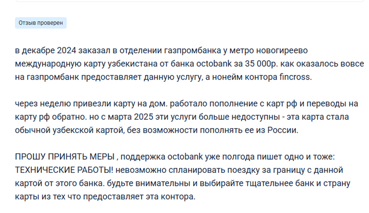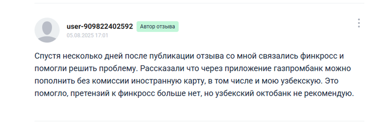 Но стоит отметить, что позже данный отзыв на карту Fincross был дополнен. Держатель пишет, что с ним связались представители саппорта и решили проблему.