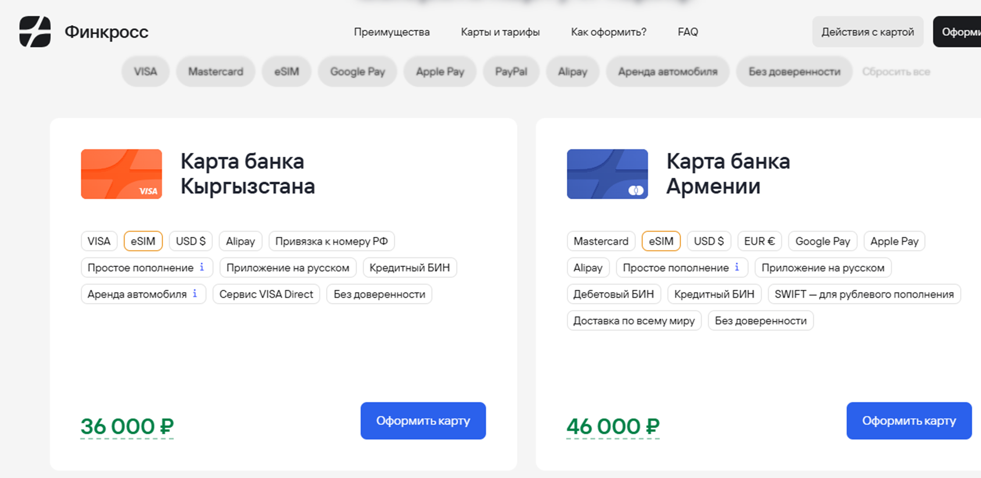 - Карта банка Кыргызстана – цена 36 000 рублей, поддержка eSim, приложение на русском, привязка к российскому номеру, аренда авто, валюта – доллары.
