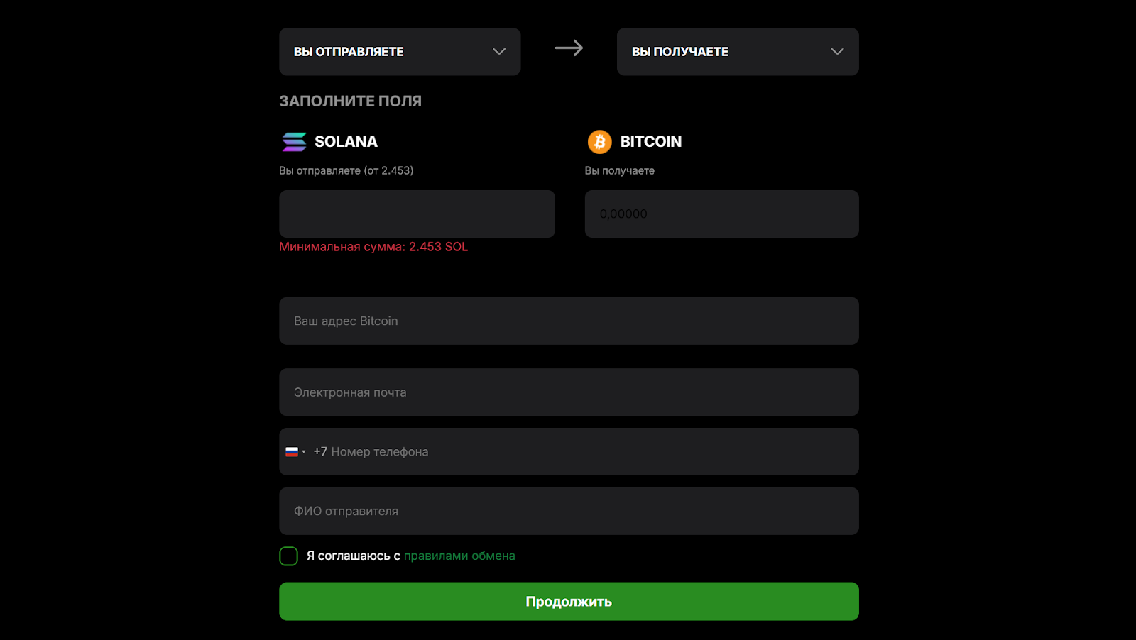 - Заполнить соответствующие поля с желаемой суммой обмена.