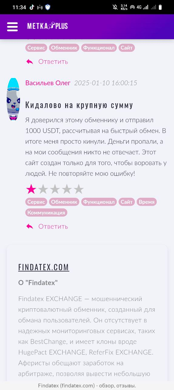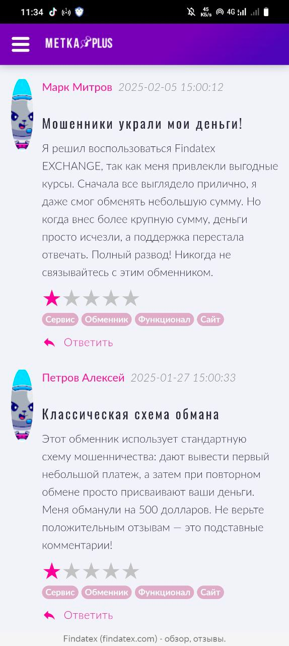 Findatex имеет негативные отзывы. Пользователи обменника жалуются на: большую задержку в обмене, полную потерю средств, неработающую техподдержку, использование схемы подмена курса