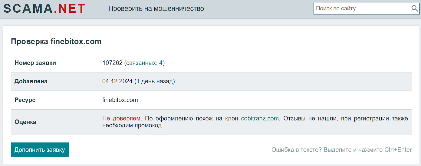 В сети нет отзывов о криптокошельке Finebitox. Мы нашли предупреждение от сервиса scama.net – результаты проверки показывают, что кошелёк Finebitox скам. Scama.net аргументирует это наличием клона – cobitranz.com.