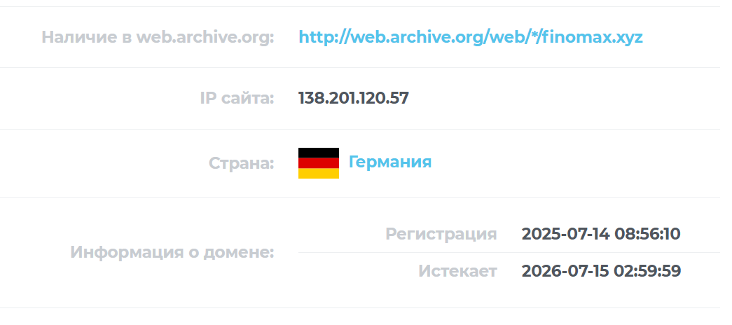 Рассматриваемая компания доступна по ссылке Finomax Xyz. Проверка домена показала, что он работает только с 14 июля 23025 года. Это означает, что на момент написания обзора сервису менее двух месяцев. При этом главный сервер находится на территории Германии.